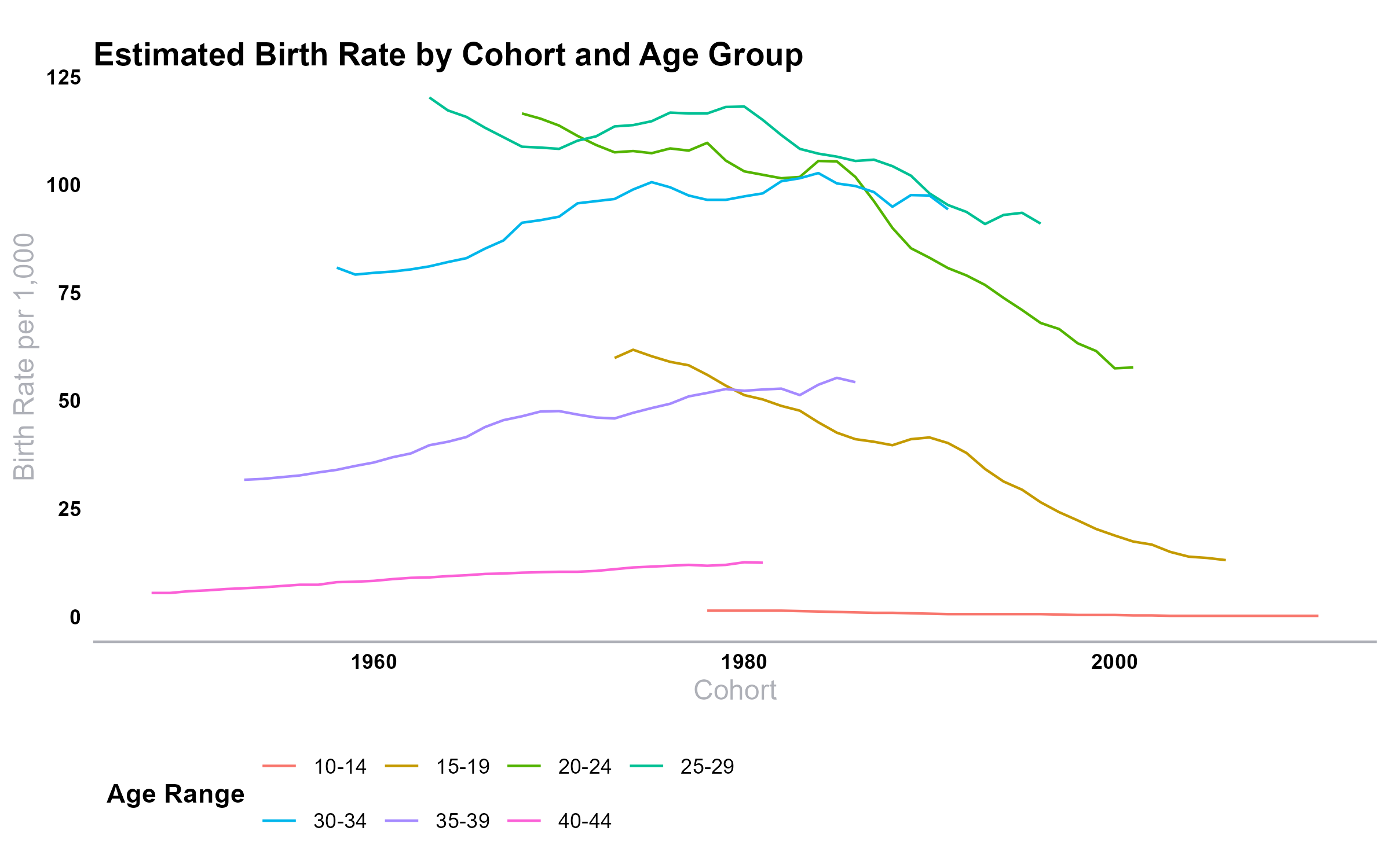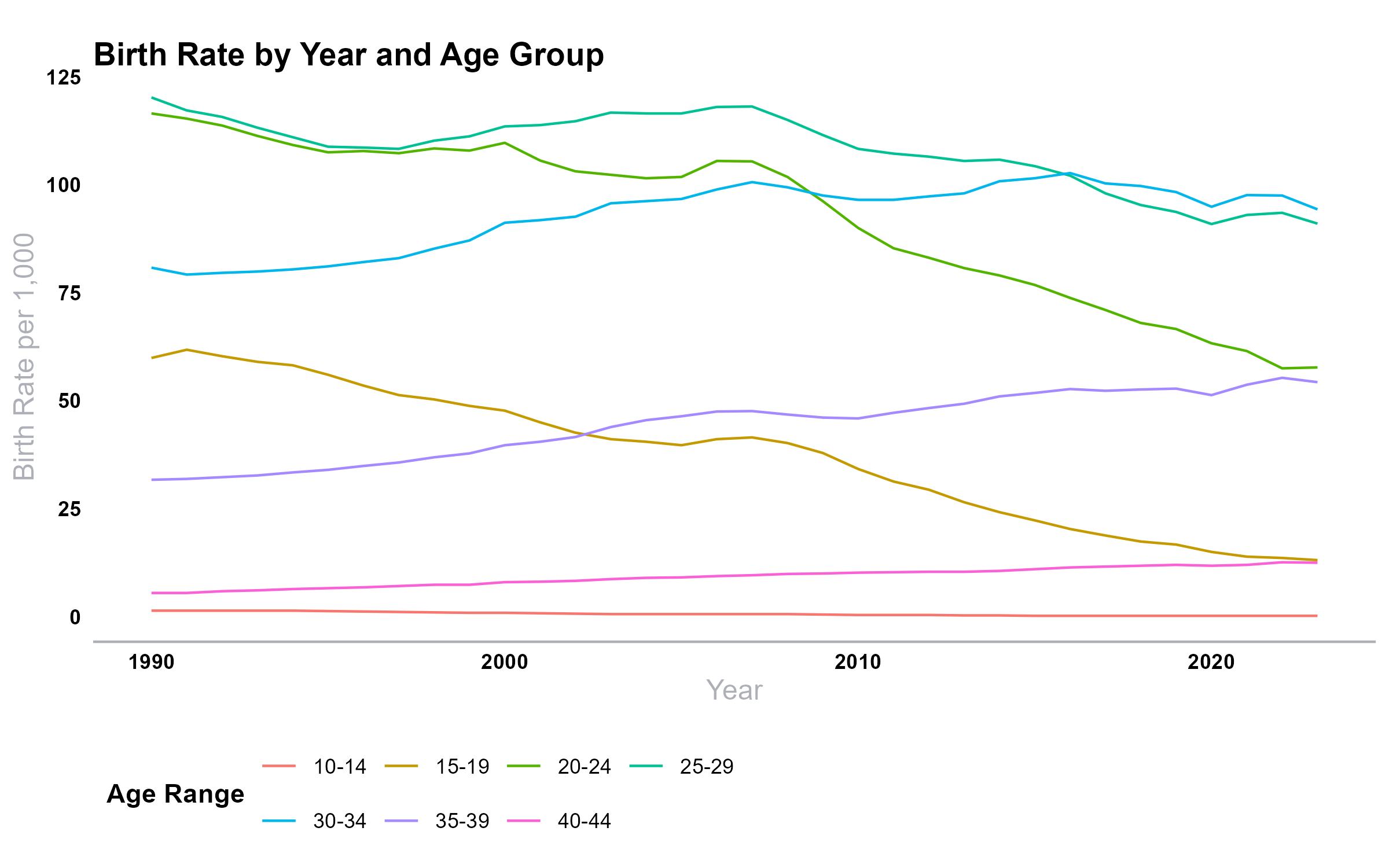 As Bechhofer pointed out to me, it can also be useful to map these data to cohorts, which is pretty easy to approximate from the same data. For example, 22 is the midpoint of the 20-24 age group, and people born in 1990 turned 22 in 2012, so I treat the 2012 rate for 20-24-year-olds as the 1990 cohort’s rate in that age range.