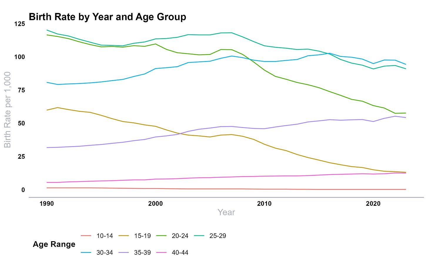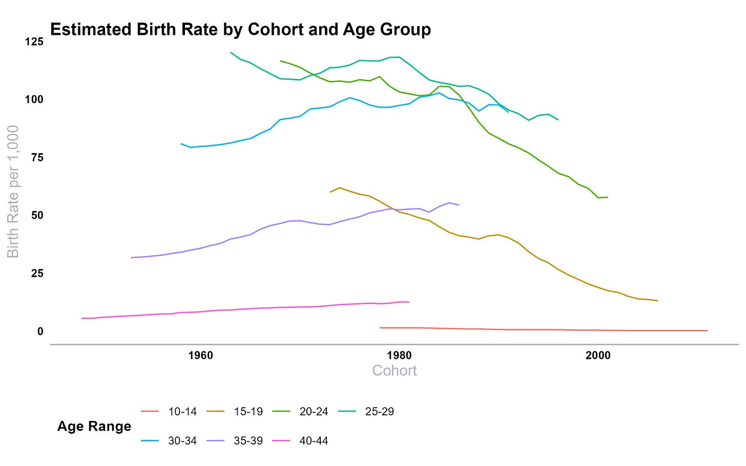 Your mileage may vary, I suppose, but to me this shows that while there was a healthy mix of increases and decreases for cohorts from the mid-’70s up to about 1985—i.e., these cohorts each lived through a mix of higher- and lower-fertility periods at different ages—things look brutal for Gen Z. Twentysomething (and, fortunately, teen) fertility is way down. Even the 30-34 group stopped rising with those born in the mid-’80s! We’re left hoping for a fertility explosion among those 35-44, or perhaps even above that, where women have historically had extremely few kids.